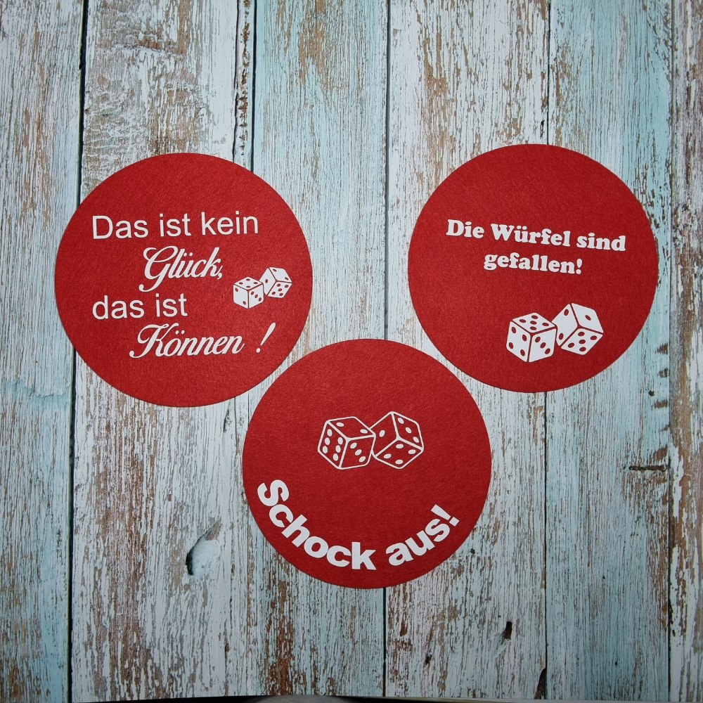 Die Filzuntersetzer mit unterschiedlichen, lustigen Sprüchen sind in jedem Fall ein tolles Highlight, über das sich jeder freut. Du kannst deine Würfelmatten farblich nach Deinen Wünschen zusammenstellen - gemischt, einheitlich.... ganz persönlich mit Namen für jeden Spieler / Spielerin ....auch das ist möglich!