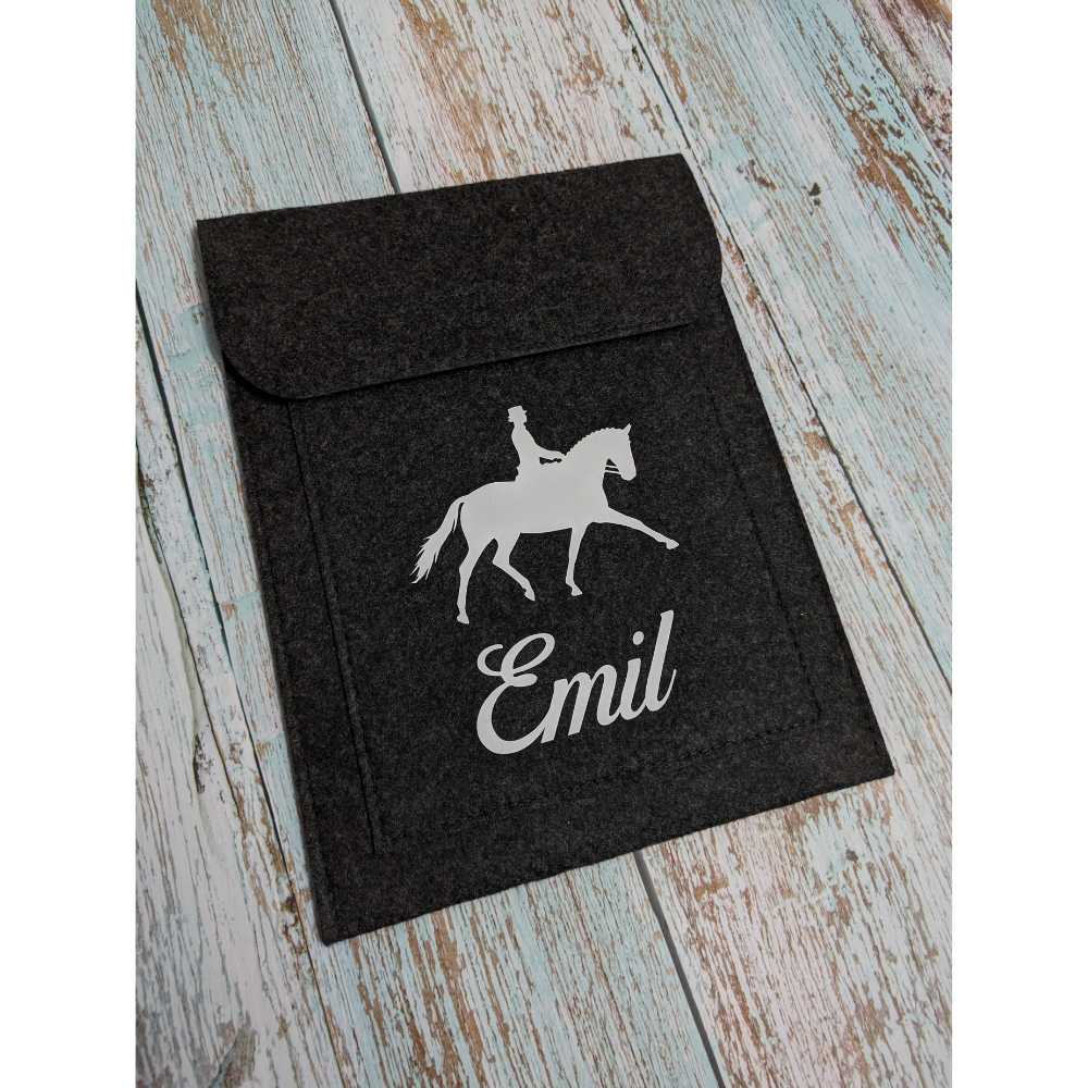 Die Hülle ist in hellgrau oder dunkelgrau erhältlich und verfügt über ein großes Hauptfach, in dem bis zu 3 Pferdepässe Platz finden.