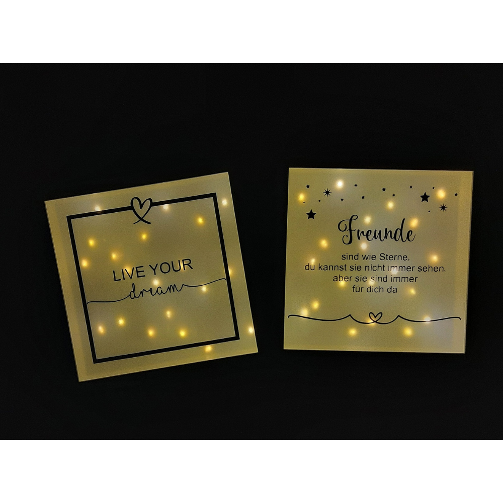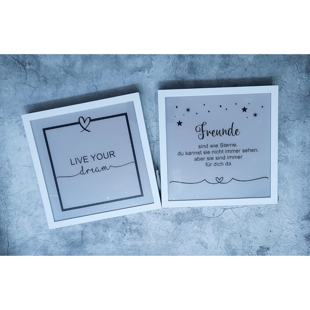Die liebevoll gestalteten Bilderrahmen mit Beleuchtung sind H/B/T 27cm/27cm/6cm.
