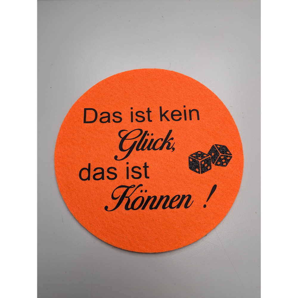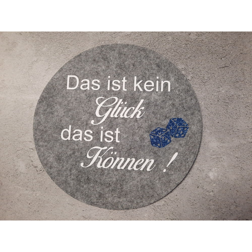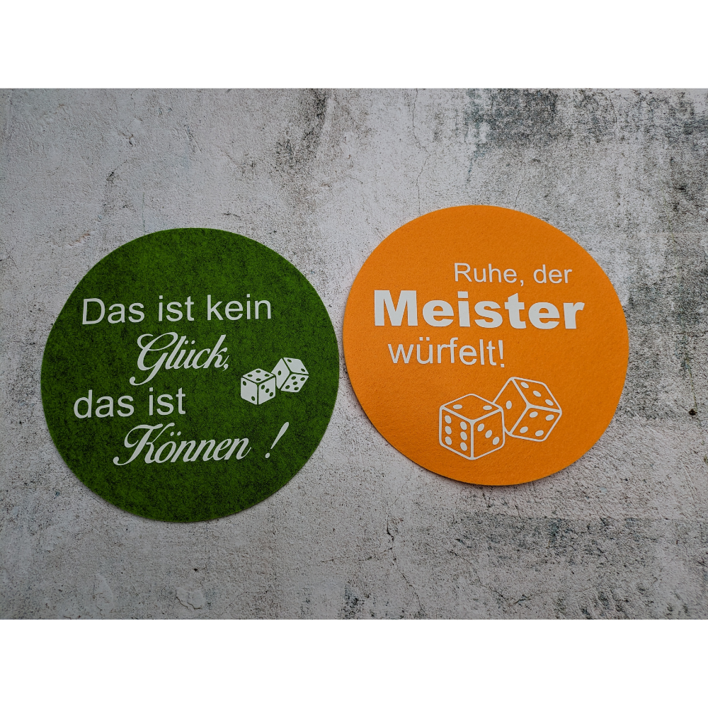 Die Filzuntersetzer mit unterschiedlichen, lustigen Sprüchen sind in jedem Fall ein tolles Highlight, über das sich jeder freut. Du kannst deine Würfelmatten farblich nach Deinen Wünschen zusammenstellen - gemischt, einheitlich.... ganz persönlich mit Namen für jeden Spieler / Spielerin ....auch das ist möglich!