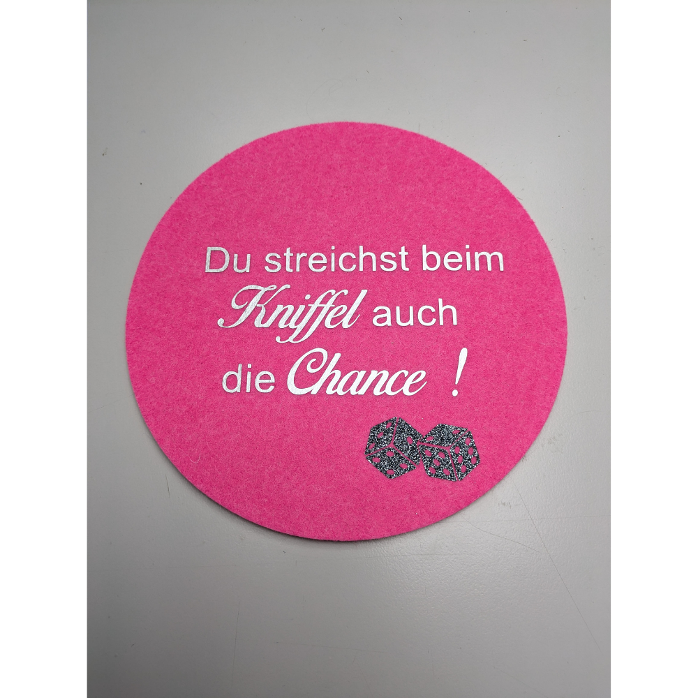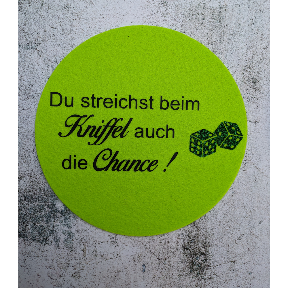 Die Filzuntersetzer mit unterschiedlichen, lustigen Sprüchen sind in jedem Fall ein tolles Highlight, über das sich jeder freut. Du kannst deine Würfelmatten farblich nach Deinen Wünschen zusammenstellen - gemischt, einheitlich.... ganz persönlich mit Namen für jeden Spieler / Spielerin ....auch das ist möglich!