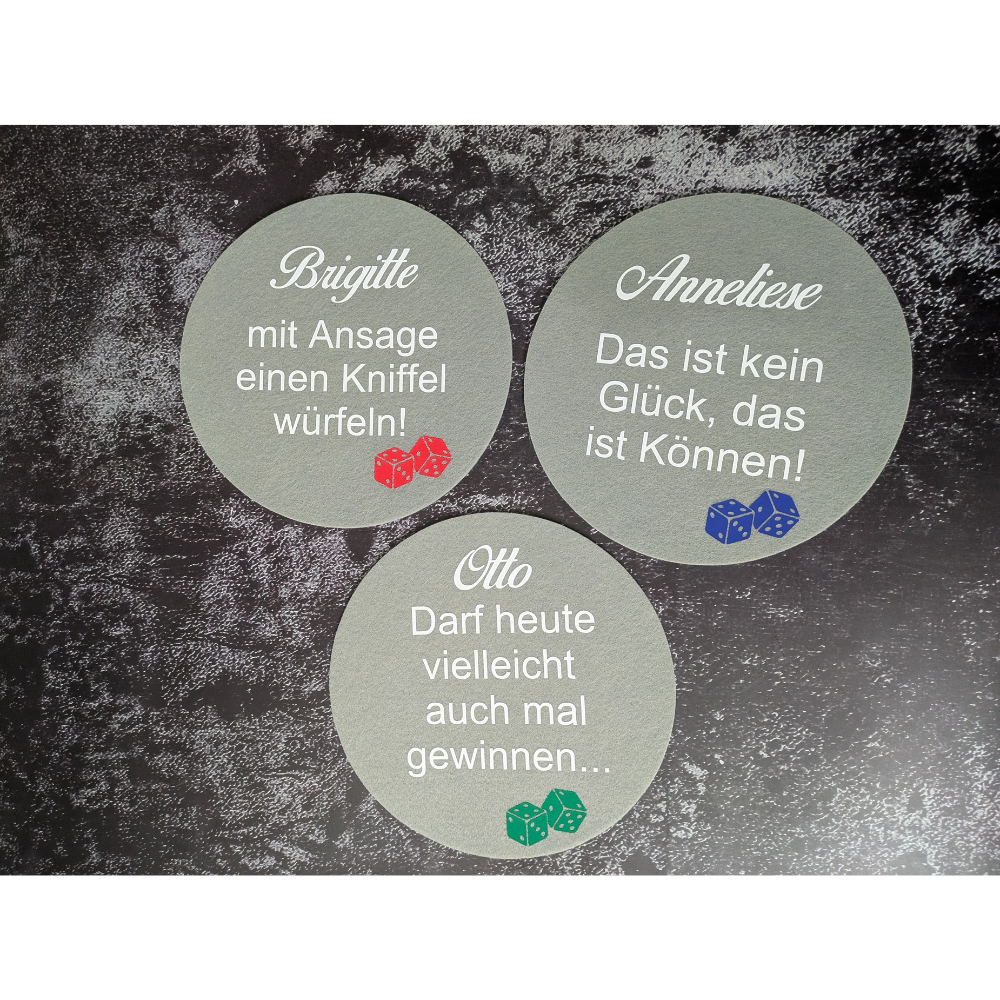 Die Filzuntersetzer mit unterschiedlichen, lustigen Sprüchen sind in jedem Fall ein tolles Highlight, über das sich jeder freut. Du kannst deine Würfelmatten farblich nach Deinen Wünschen zusammenstellen - gemischt, einheitlich.... ganz persönlich mit Namen für jeden Spieler / Spielerin ....auch das ist möglich!