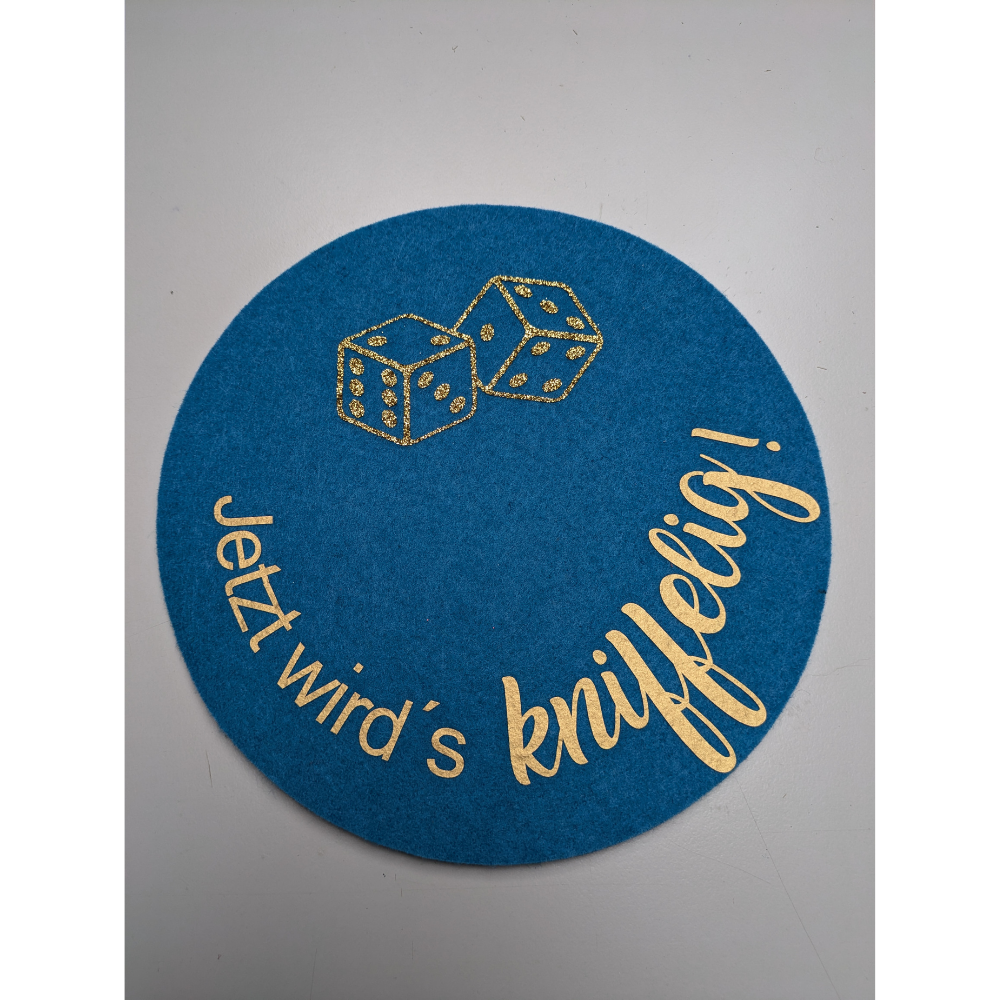 Die Filzuntersetzer mit unterschiedlichen, lustigen Sprüchen sind in jedem Fall ein tolles Highlight, über das sich jeder freut. Du kannst deine Würfelmatten farblich nach Deinen Wünschen zusammenstellen - gemischt, einheitlich.... ganz persönlich mit Namen für jeden Spieler / Spielerin ....auch das ist möglich!