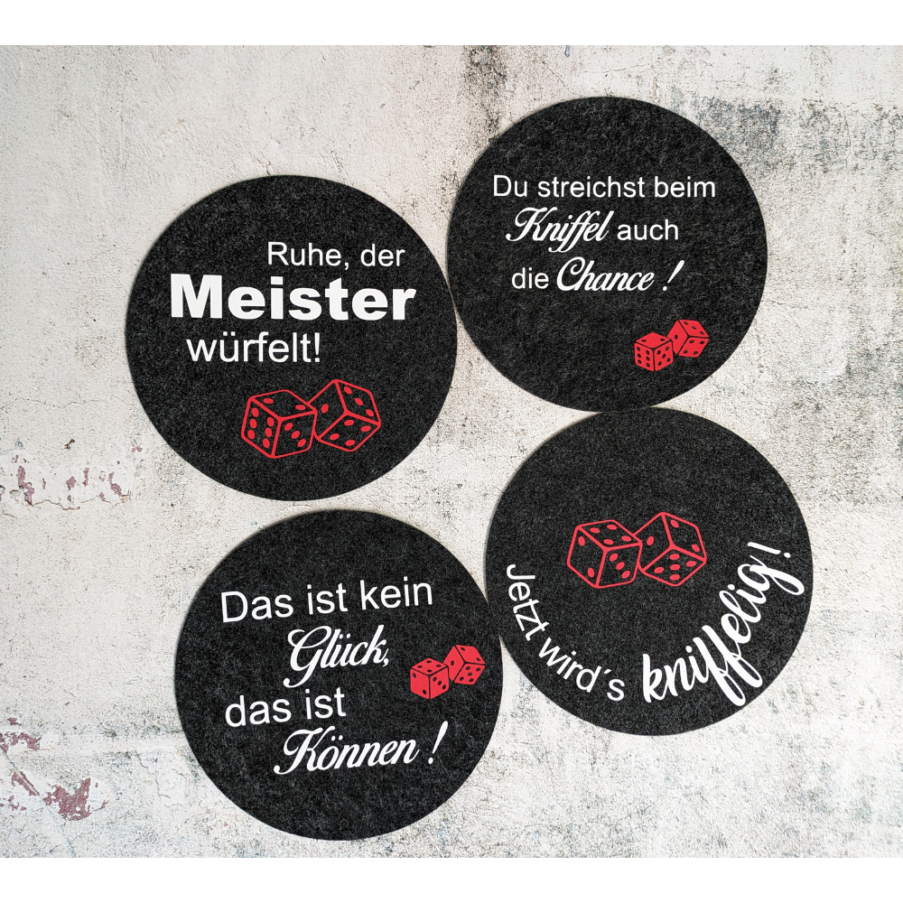 Die Filzuntersetzer mit unterschiedlichen, lustigen Sprüchen sind in jedem Fall ein tolles Highlight, über das sich jeder freut. Du kannst deine Würfelmatten farblich nach Deinen Wünschen zusammenstellen - gemischt, einheitlich.... ganz persönlich mit Namen für jeden Spieler / Spielerin ....auch das ist möglich!